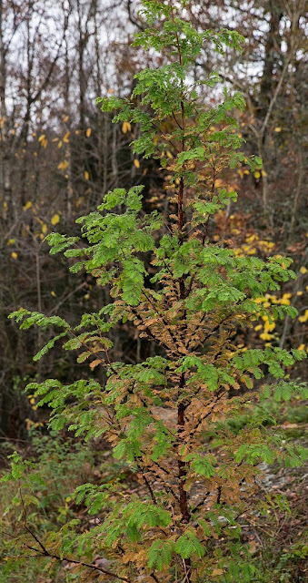 Metasequoia glyptostroboides föll jag för under en resa i Cornwall 2008. Med i bagaget hem hade jag en liten planta som jag planterade på landet. Under flera år har den varit mer eller mindre bortglömd för den har knappt synts bland det höga gräset men nu står den där äntligen och tar plats. Att få se den så stor och ståtlig som exemplaret jag såg i Cornwall får jag nog aldrig uppleva men det är roligt att se att den trivs och bara blir större och större.